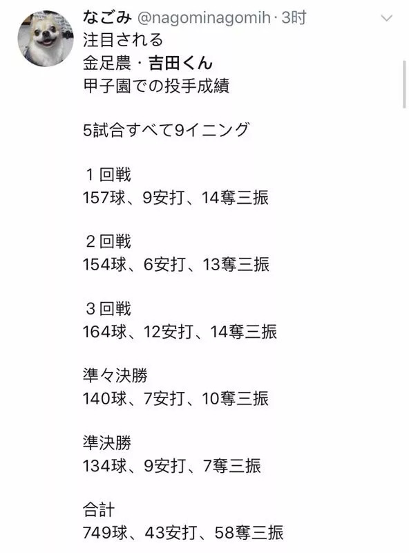 截止半决赛,吉田同学已投出749球,43安打,58夺三振,连续四场2位数夺三振,140km以上球速的投球也能连发,甚至前几场在投完160+个球后飙出了150km的球速......头脑和技术所向无敌,创72年以来最强投手的记录,被媒体称为“平成最后的怪物”。